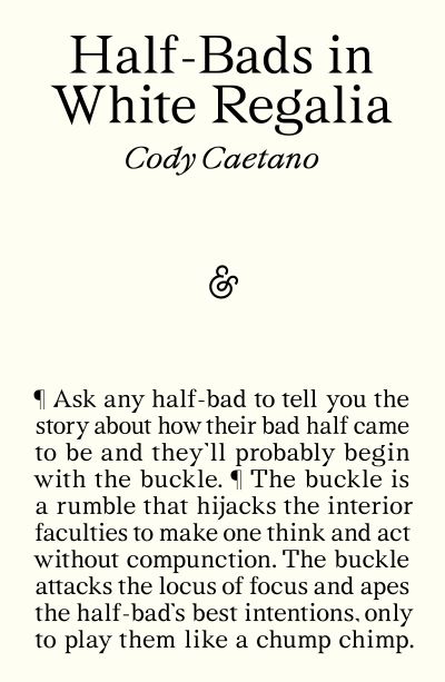 Capturing the chaos and wonder of a precarious childhood, Cody Caetano delivers a fever dream coming-of-age garnished with gaming, a doomed house in Happyland, and an electric slang all his own. Half-Bads in White Regalia is an unforgettable debut that unspools a tangled family history with warmth, humour, and deep generosity.